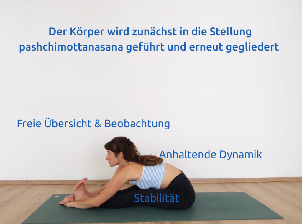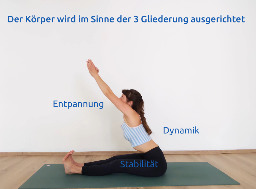 In der vorbereitenden Phase wird der Körper im Sinne der Dreigliederung geordnet: Stabile Basis der aufliegenden gestreckten Beine – dynamische Ausdehnung im 3. Chakra in der Mitte der Wirbelsäule – relativ entspannter Kopf-, Schulter- und Nackenbereich. Die Dynamik aus der Mitte steigert sich zu einer intensiven Längsausdehnung in der Wirbelsäule. Durch die zielgerichtete Dynamik im 3. Chakra erhält die Übung einen geordneten und zugleich aktiven Ausdruck.