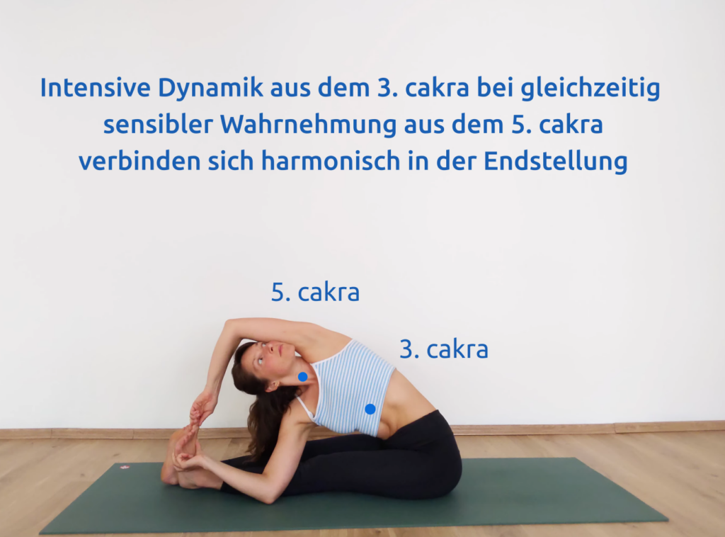 Während sich das 3. Chakra mehr durch eine ausdehnende Dynamik aus der Mitte der Wirbelsäule ausdrückt, gewinnt die Asana durch das 5. Chakra einen sensiblen und empfangenden Charakter. In der gedrehten Kop-Knie-Stellung, Parivrtta Paschimottanasana, finden beide Zentren in eine harmonische Expression.