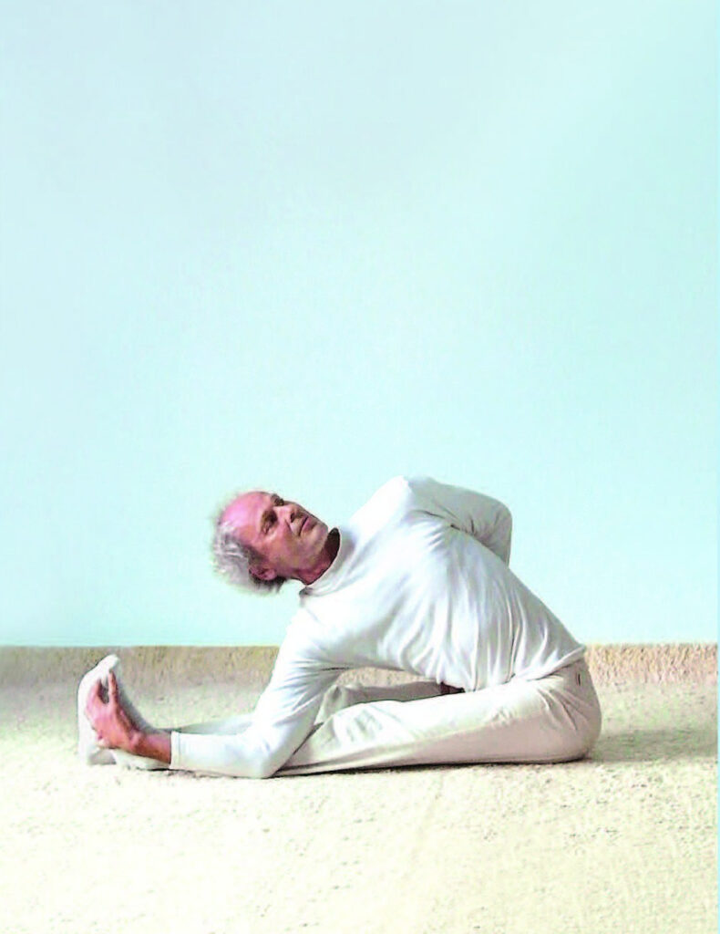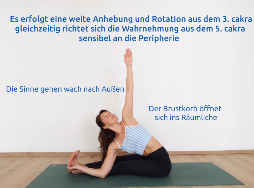 Auf die Ausdehnung erfolgt nun die Drehung aus dem unteren, vor allem aber aus dem mittleren Rücken. Die Stellung öffnet sich ins Räumliche und erfährt durch den nach oben strebenden Arm eine zusätzliche Anhebung. Die Längsausdehnung wird auch während der Rotation stets beibehalten. In der Endstellung verbindet sich die aktive Willensdynamik aus dem 3. Chakra mit der sensiblen Offenheit im 5. Chakra zu einer harmonischen Komposition.
