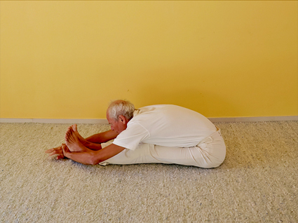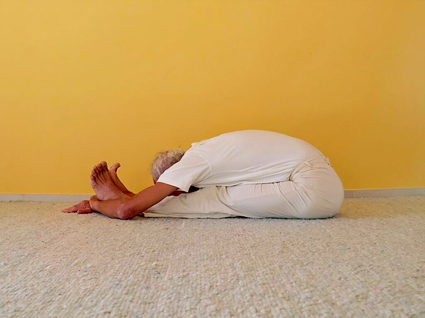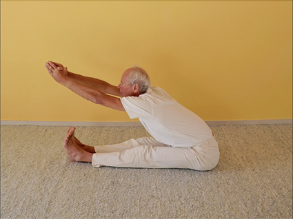 Im Focus steht die Ausführung der Kopf-Knie-Stellung – paścimottānāsana durch Heinz Grill. Der Sanskrit Name bedeutet die Streckung des Westens oder physiologisch gesehen des Rückens. Der Rücken wurde früher der Himmelsrichtung des Westens zugeordnet.